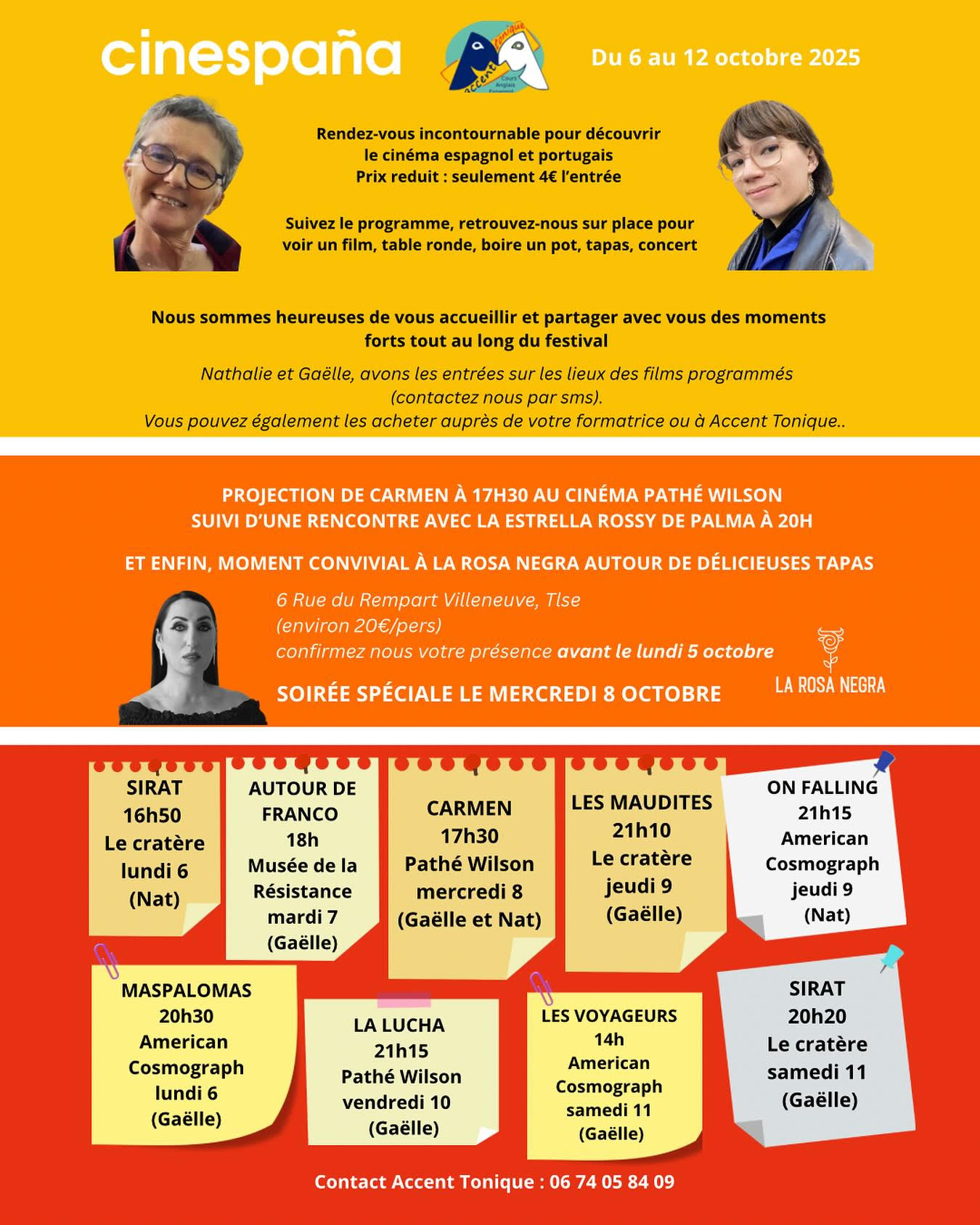- Mercredi 8 octobre : Projection de Carmen (17h30 au Pathé Wilson) suivie d’une rencontre avec l’actrice Rossy de Palma à 20h, puis soirée tapas conviviale à La Rosa Negra.